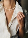 - Mother-of-pearl button closure at center front