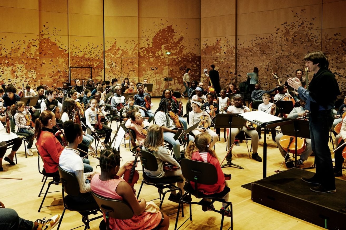 Les enfants ouvrent les bras, se courbent, lancent une jambe en cadence. Devant eux, une cheffe d’orchestre et une danseuse les guident, mouvement après mouvement. À leur gauche, une douzaine de musiciens jouent Kalinifta, un chant traditionnel gréco-italien. Plus tard, garçons et fillettes chantent, sans autre support que la musique et la voix de la cheffe de cœur. « Ici, l’apprentissage se fait par les sens et l’oralité », explique Lucas, leur référent pédagogique, par ailleurs tromboniste. Pas de solfège, uniquement l’écoute et la dynamique du groupe. Nous sommes dans le Studio, l’une des plus belles salles de répétition la Philharmonie de Paris, et les élèves en tutti – ensemble – sont les heureux bénéficiaires du programme Démos, dispositif d’éducation musicale et orchestrale à vocation sociale.