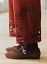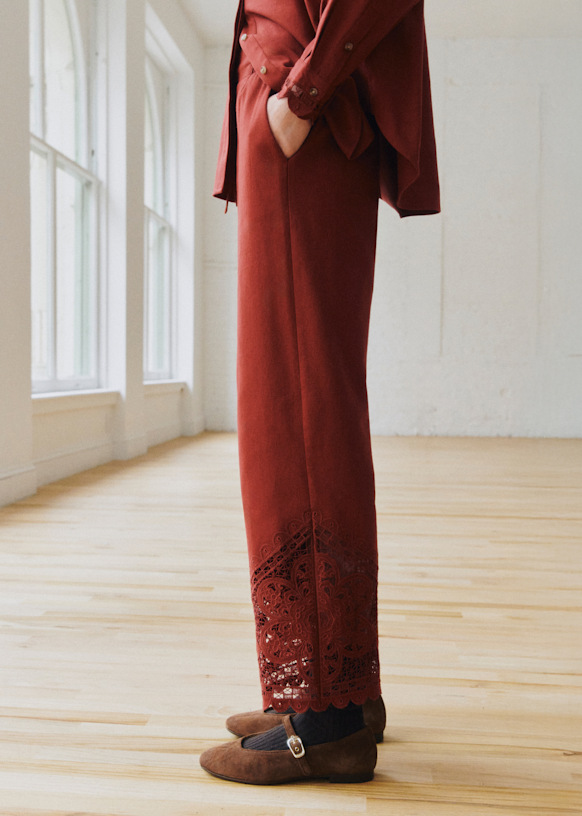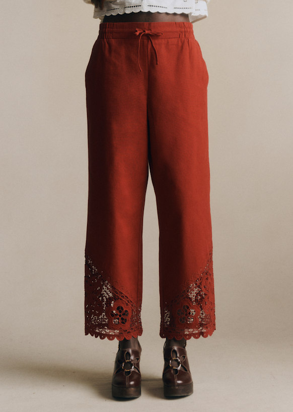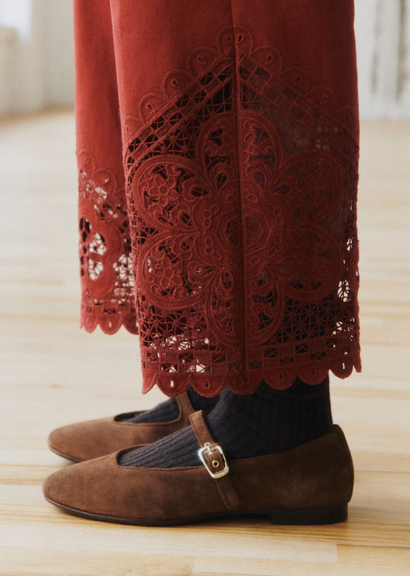 - Openwork embroidery with scalloped edge on the leg hem