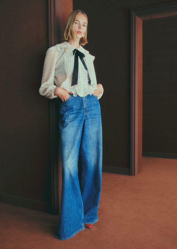 - Pleated collar with velvet tie