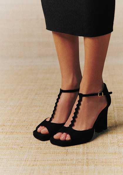 - The heel, a false flat, is contemporary, slightly flared and sculpted with edges. The sandal fastens with a buckle strap at the ankle.