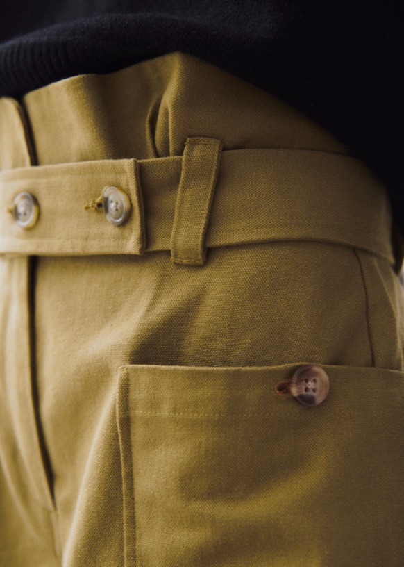- Paperbag cut cinched by a removable belt with buttons