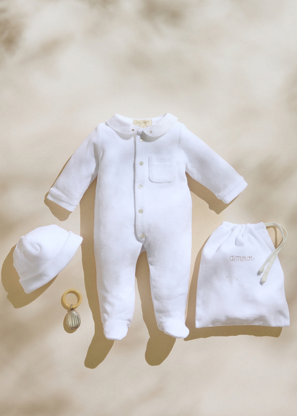 - Organic cotton pajamas with a bonnet and a pouch