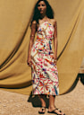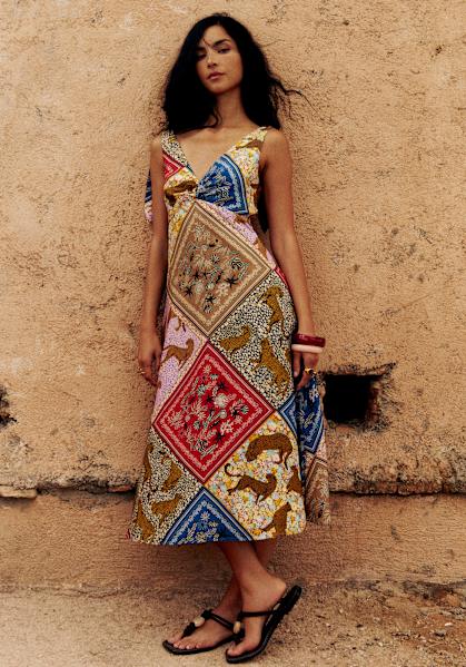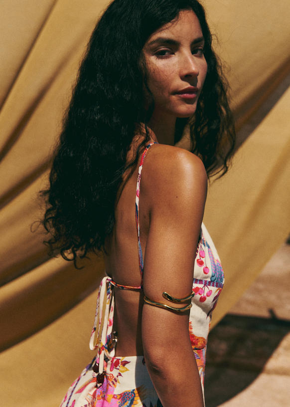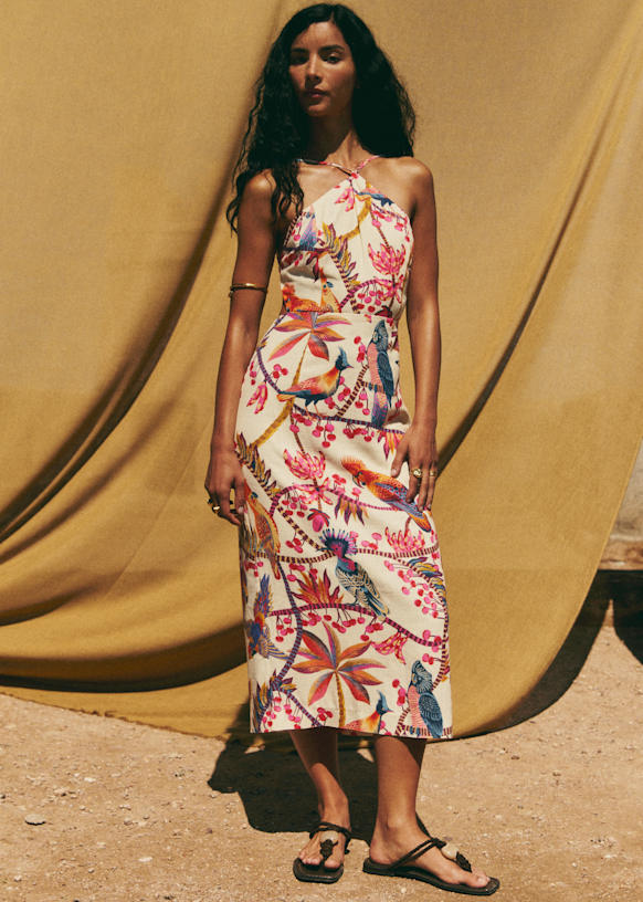 - Vestido midi estampado con tirantes finos que se atan en la espalda