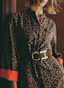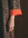 - Contrasterende oranje details aan de binnenkant van de manchet en onderaan de jurk