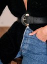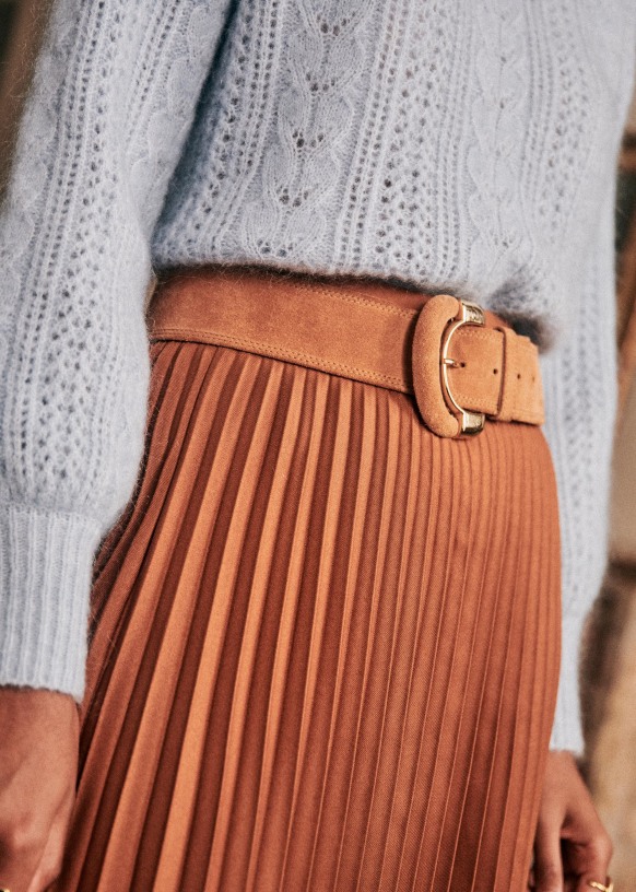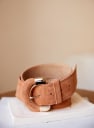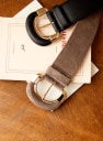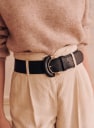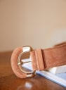 - Détail de boucle enrobée en cuir et pièce métallique or clair