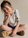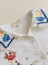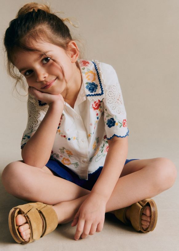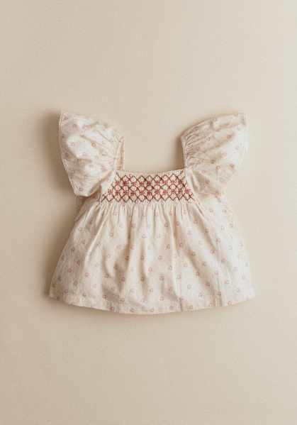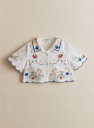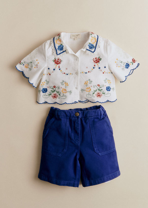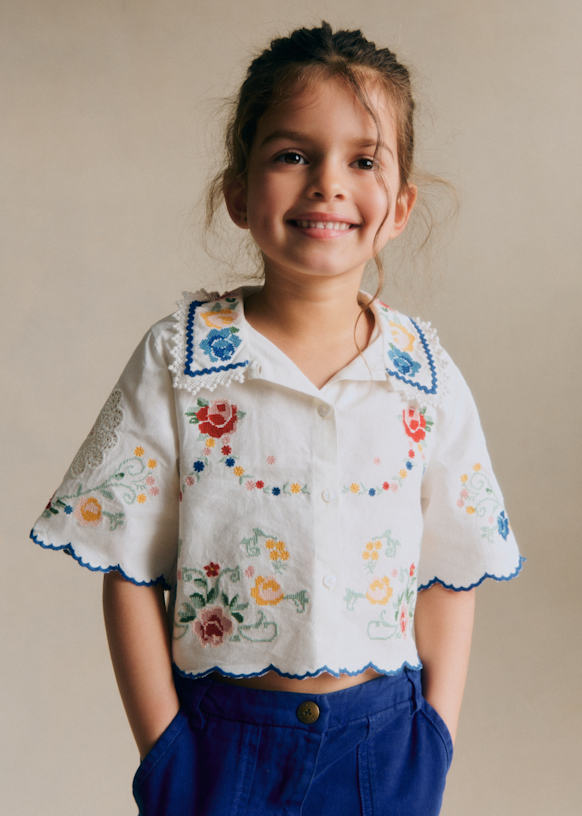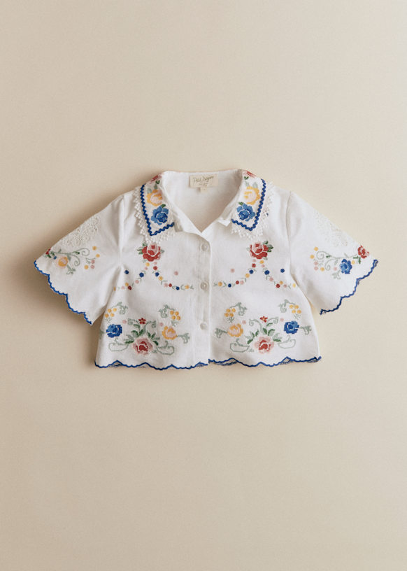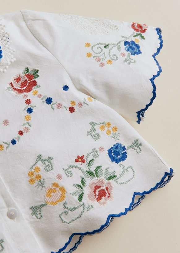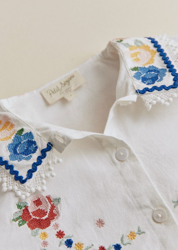 - Finition festonnée à l’encolure, en bas de manches et en bas du vêtement