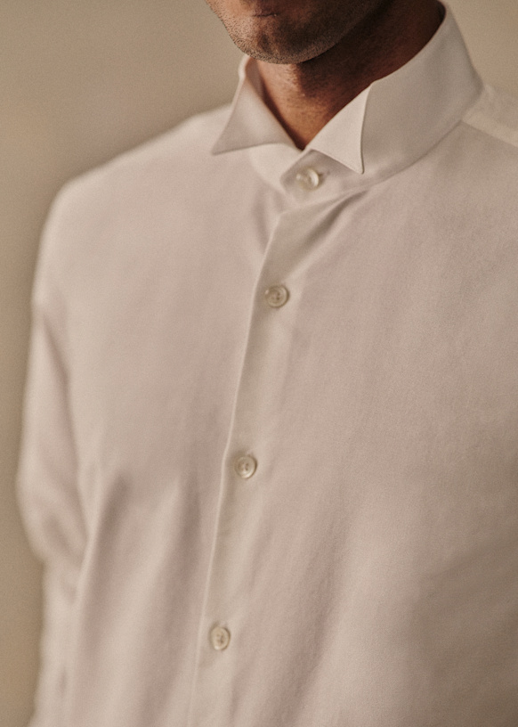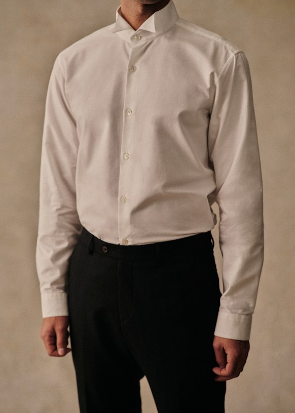 Confectionnée au Portugal, cette chemise formelle classique avec col cassé est idéale pour porter un nœud papillon. Élégante et intemporelle, elle complète parfaitement vos tenues habillées.