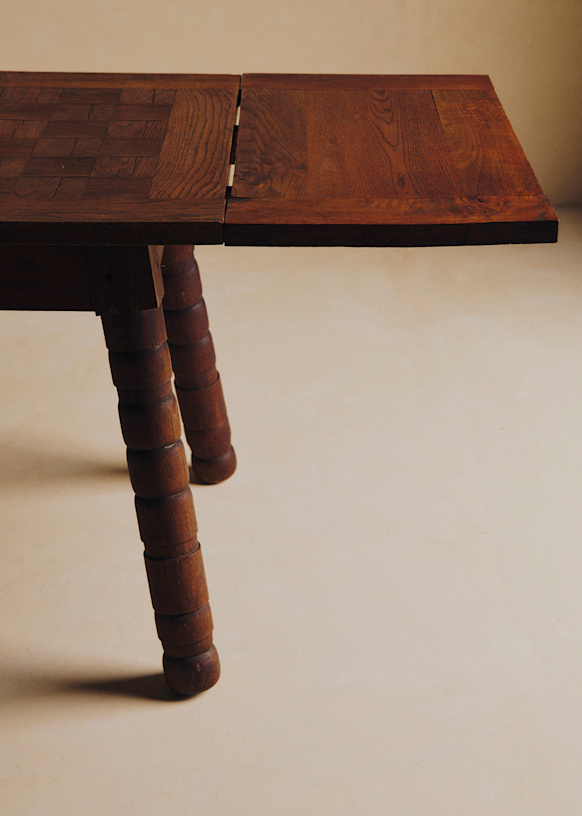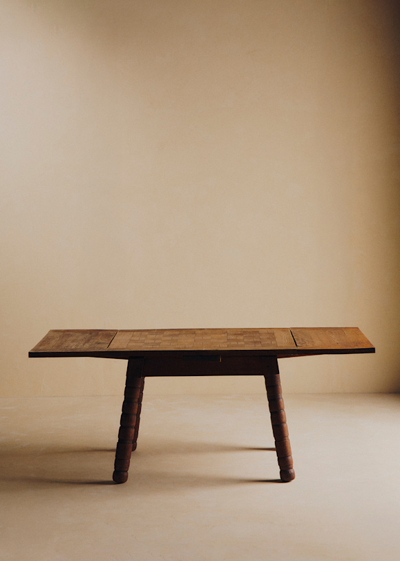 - Table à manger vintage plateau damier et pied en bois tourné