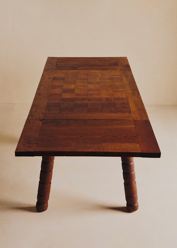 Table à manger vintage italienne à piètement en bois tourné et plateau damier