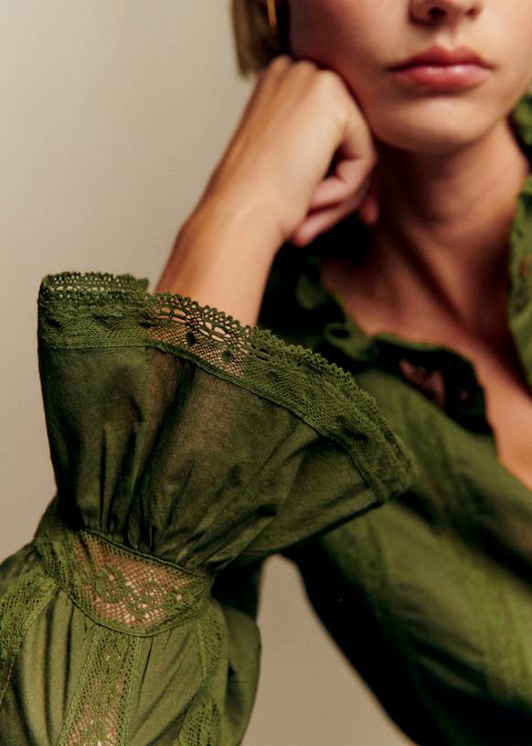 - Ricamo all'uncinetto lungo la patta di abbottonatura, al colletto e ai polsini