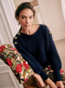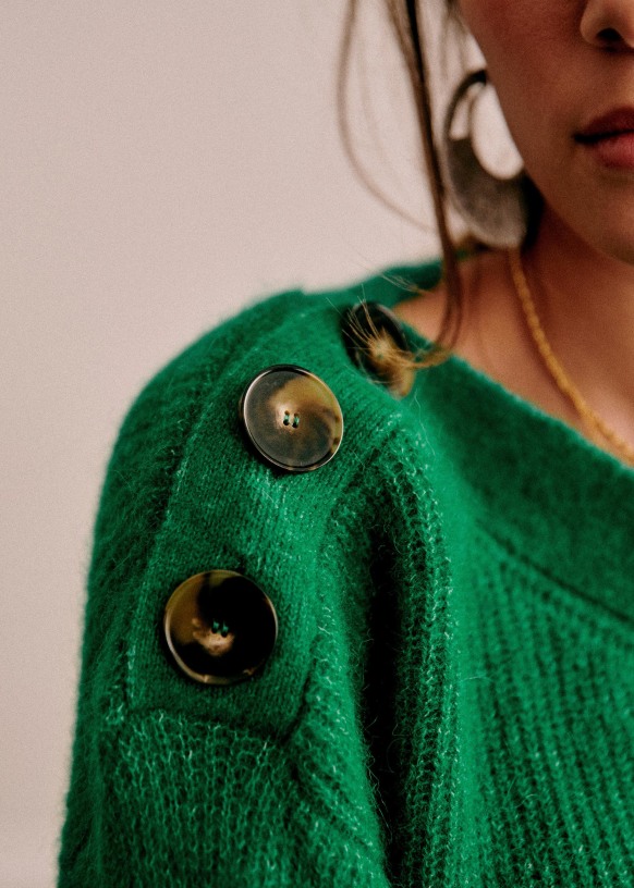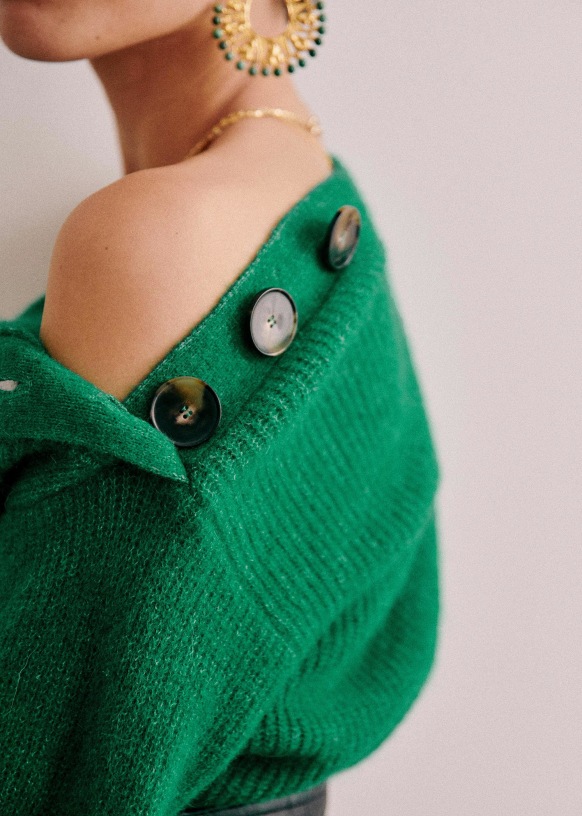 - Scollo a barchetta chiuso da una patta di abbottonatura alle spalle