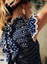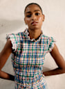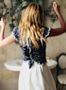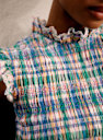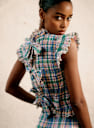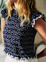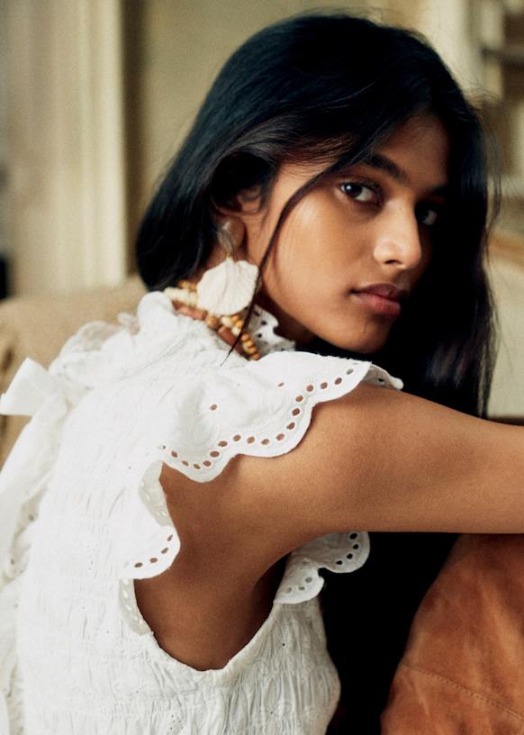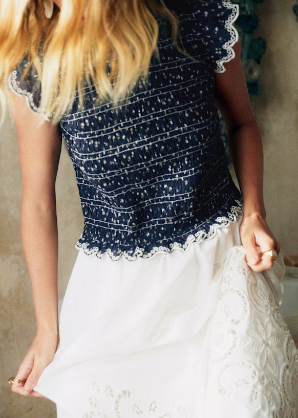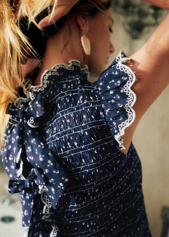- ネックライン、アームホール、ヘムラインに刺繍入りフラウンス。