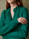 - Afgewerkt met crochet langs de knopenlijst en rond de hals
