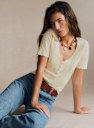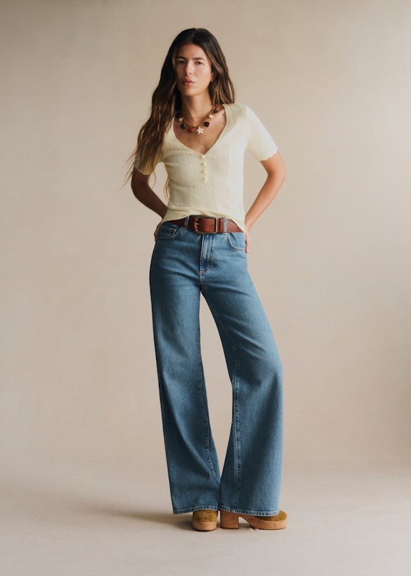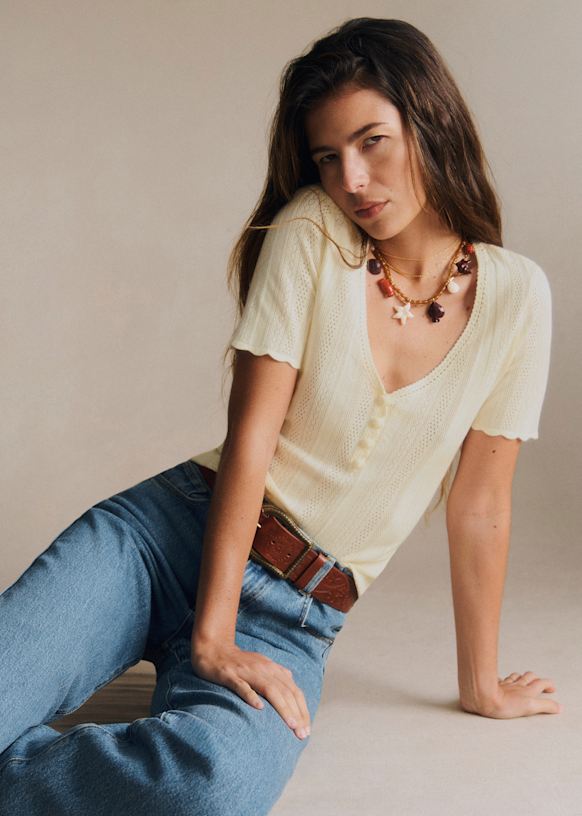 • Vierkante hals met gehaakte afwerking en een knoopsluiting