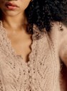 - Afgewerkt met haakwerk langs de knopenlijst en rond de hals