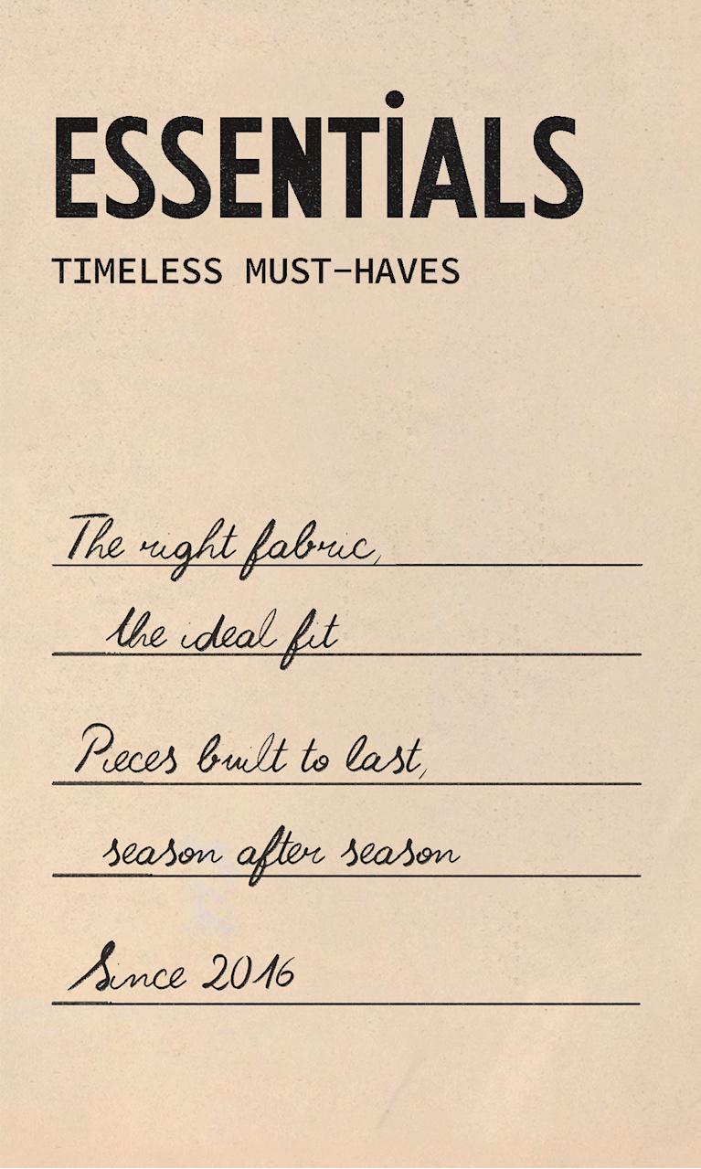 Porque há mil e uma maneiras de vestir, mas apenas uma maneira de ir direto ao essencial. (Re)descubra os nossos Essentials, a nossa gama de roupa intemporal e essencial, cada vez mais sofisticada e responsável.