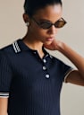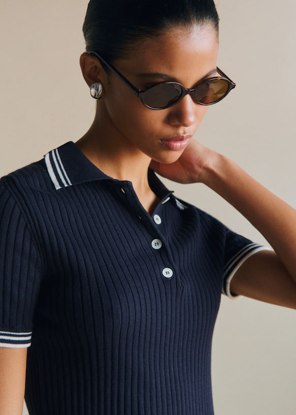- Acabamentos contrastantes na gola e no final das mangas