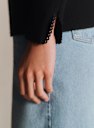 - Acabamentos em crochê na parte inferior do corpo e punhos