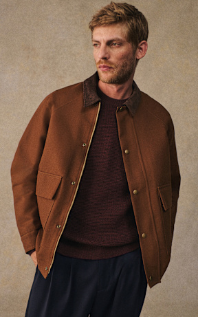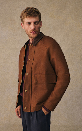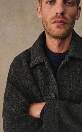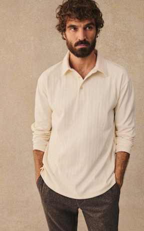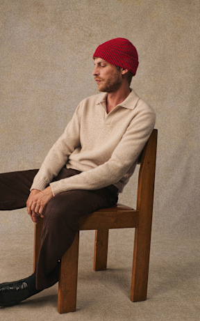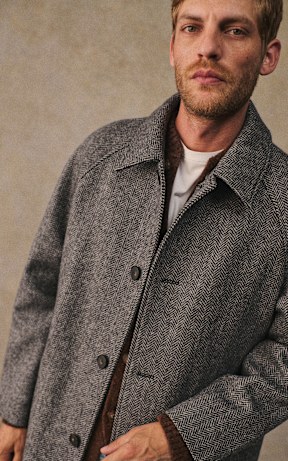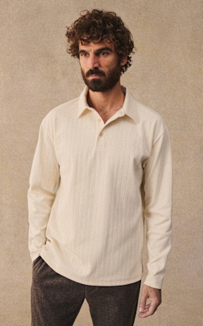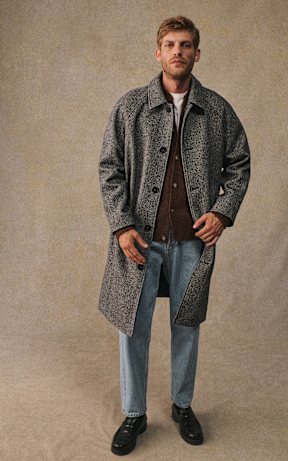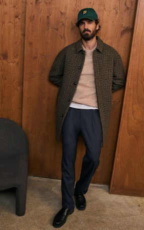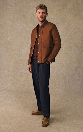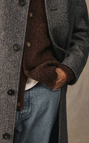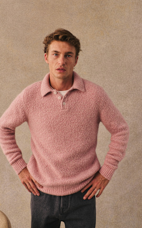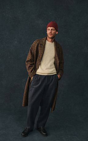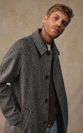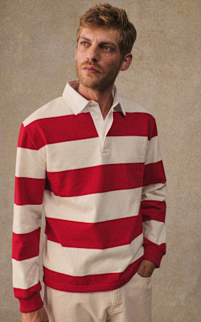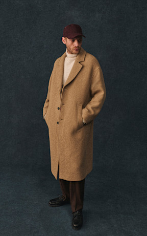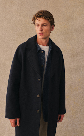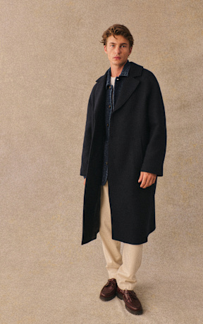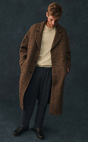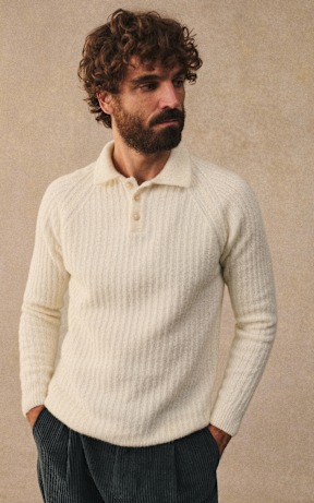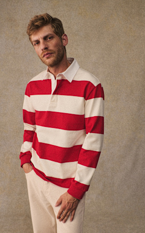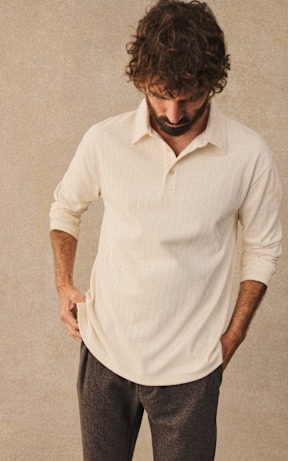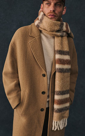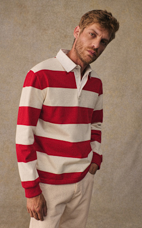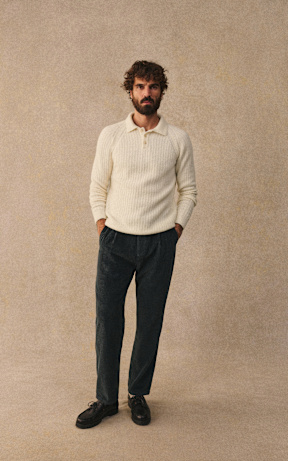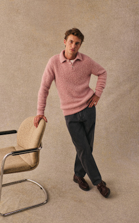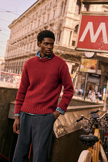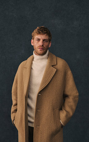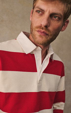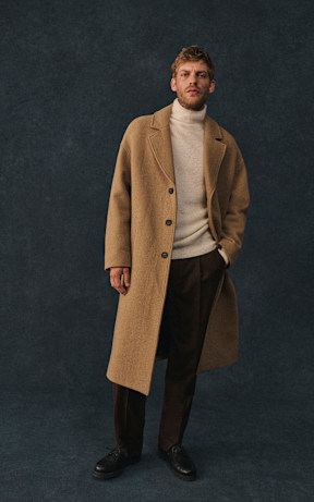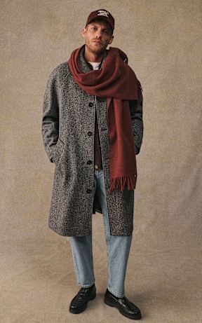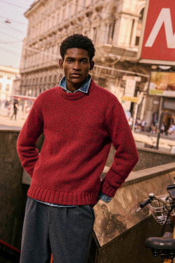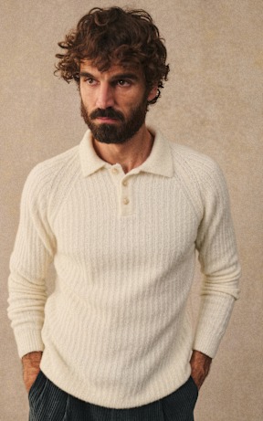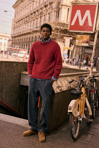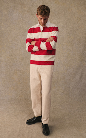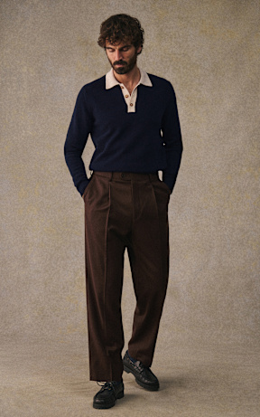A polo, a blazer, and a touch of red energize the look, balanced by long coats and fluid volumes for a modern, elegant, and comfortable style.