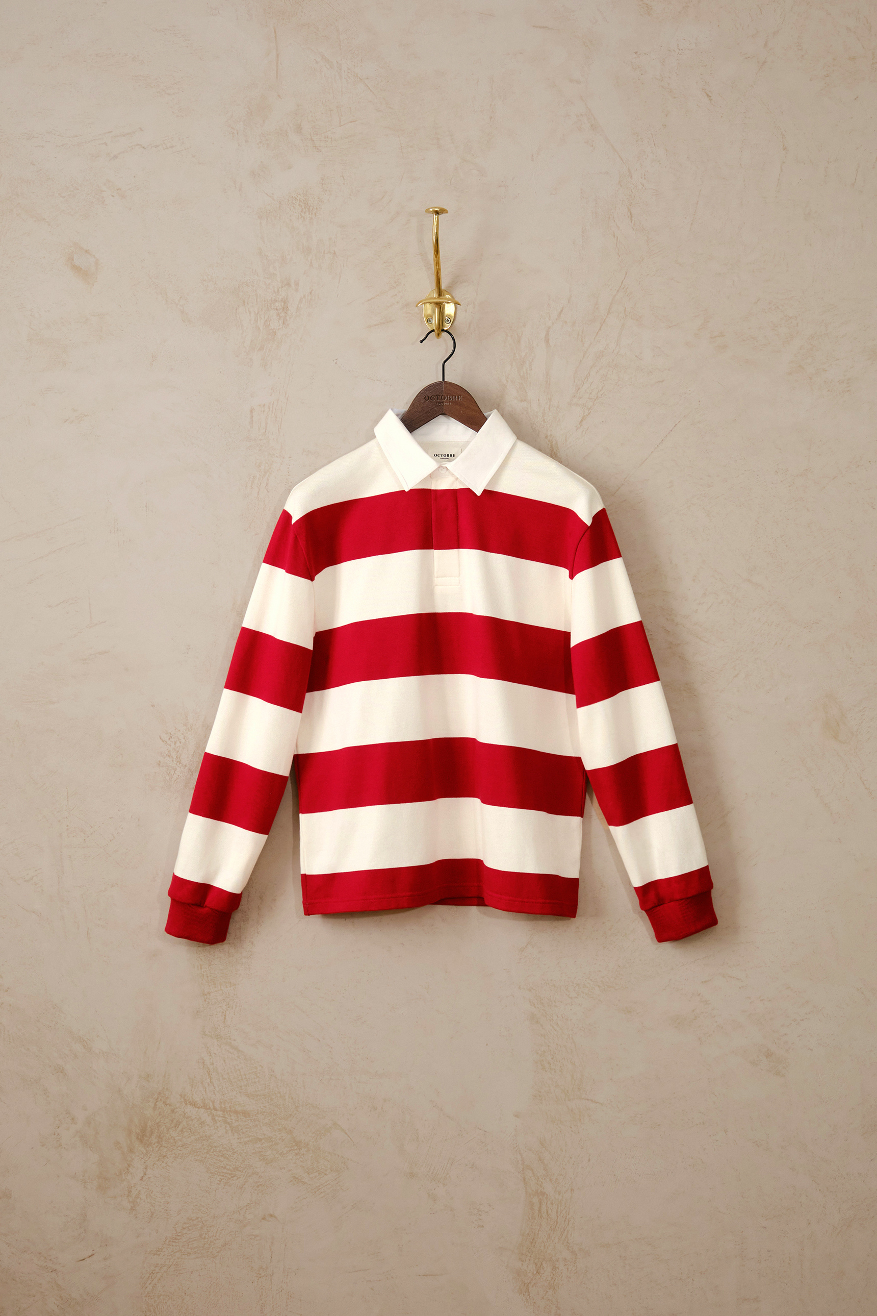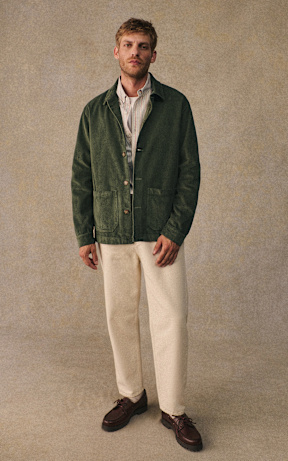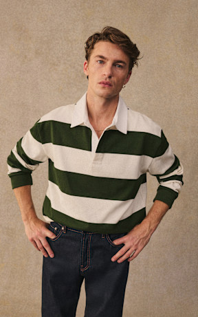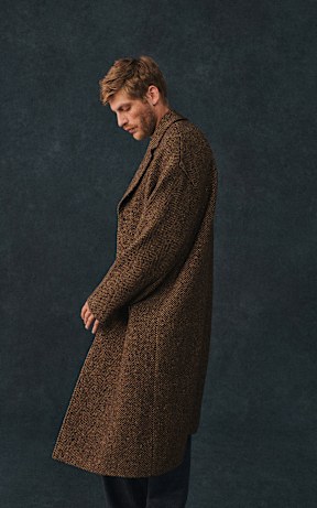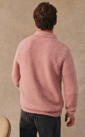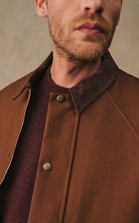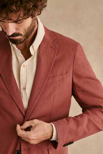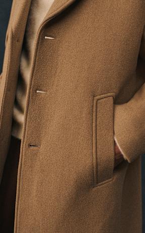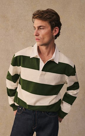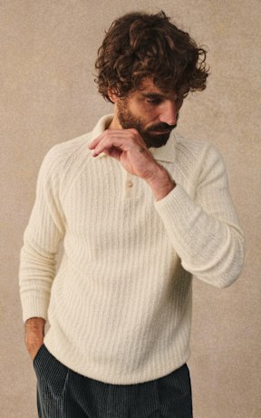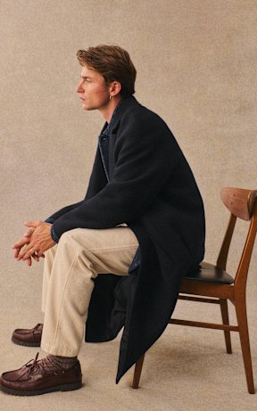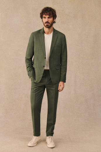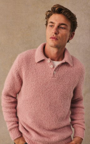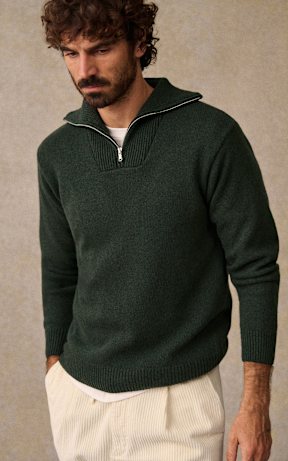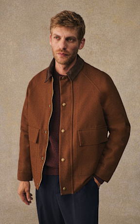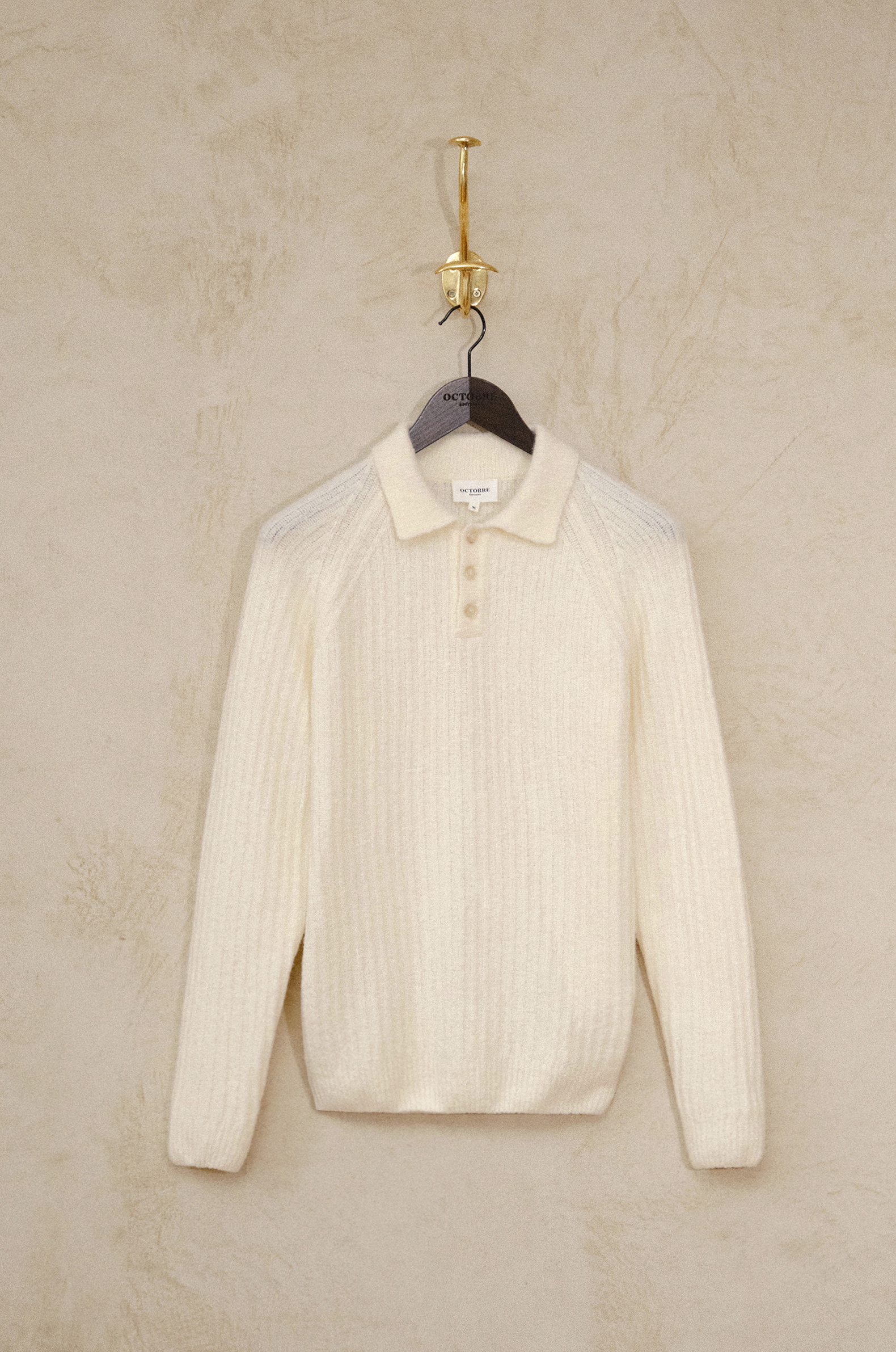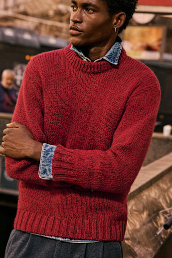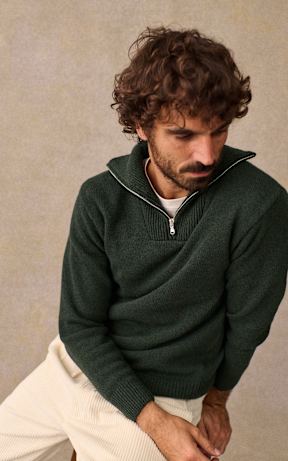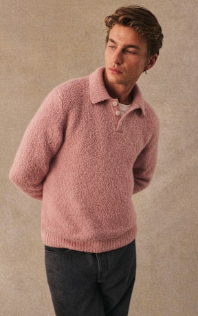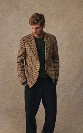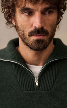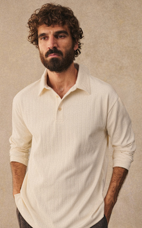A polo, a blazer, and a touch of red energize the look, balanced by long coats and fluid volumes for a modern, elegant, and comfortable style.