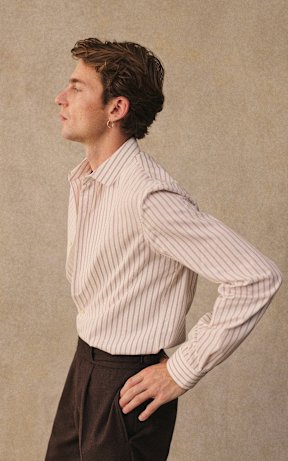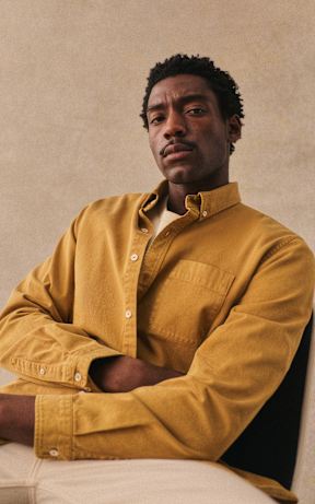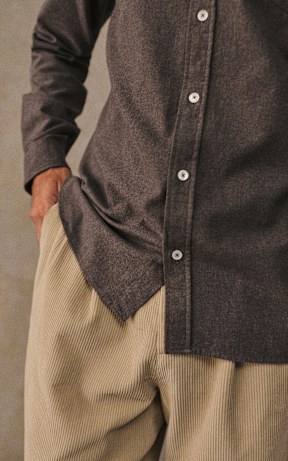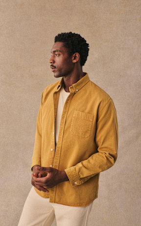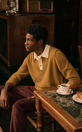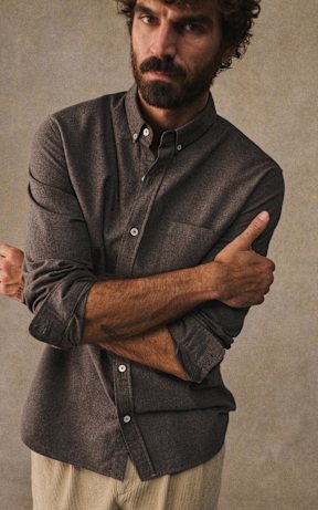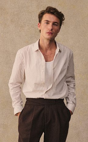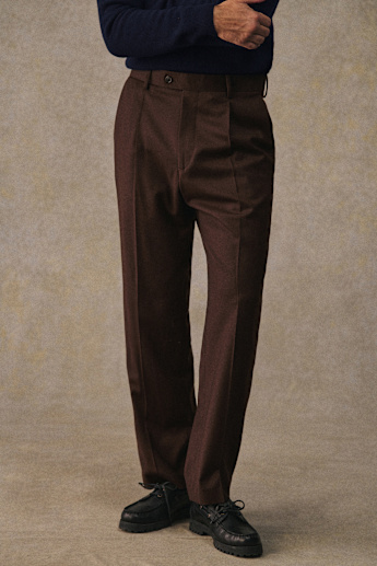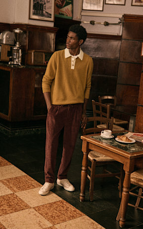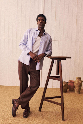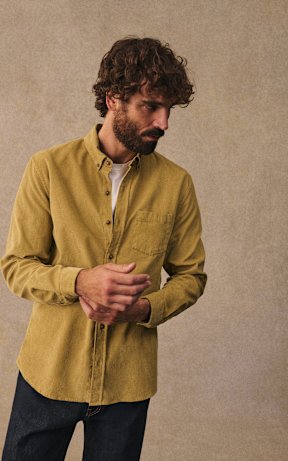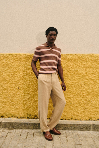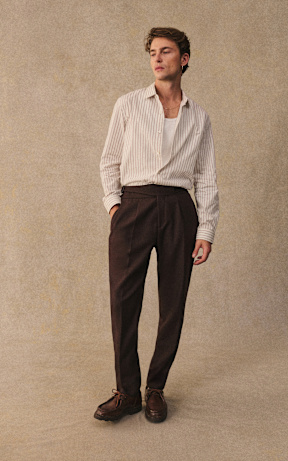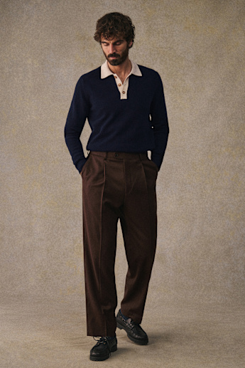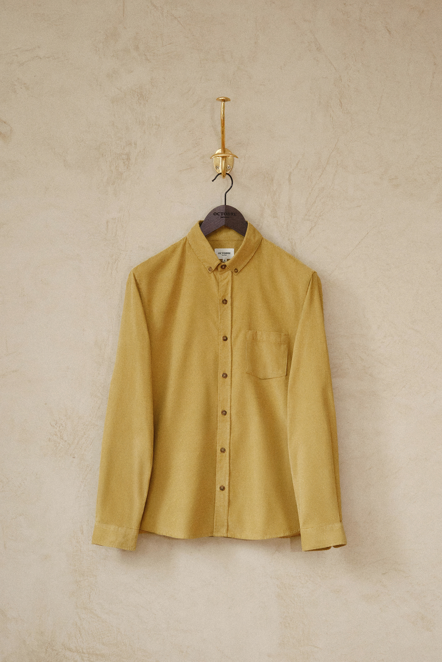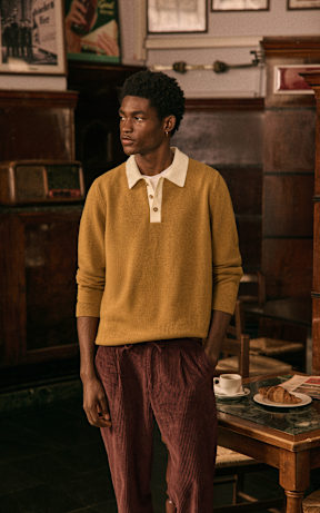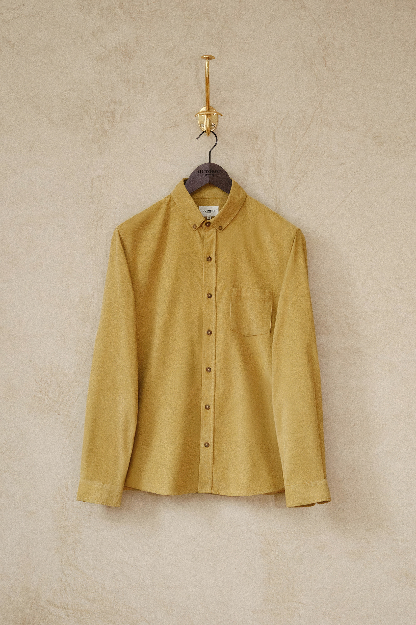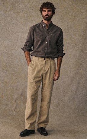 A yellow shirt and oversized brown trousers: a duo that plays with contrasts and volumes. Bold effortlessly, modern and comfortable—a look that expresses personality with style.