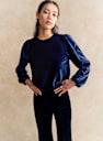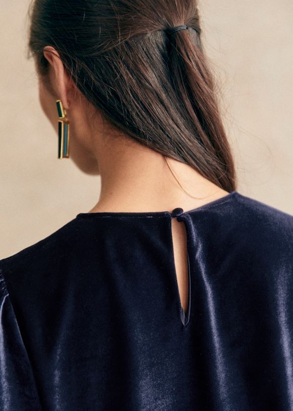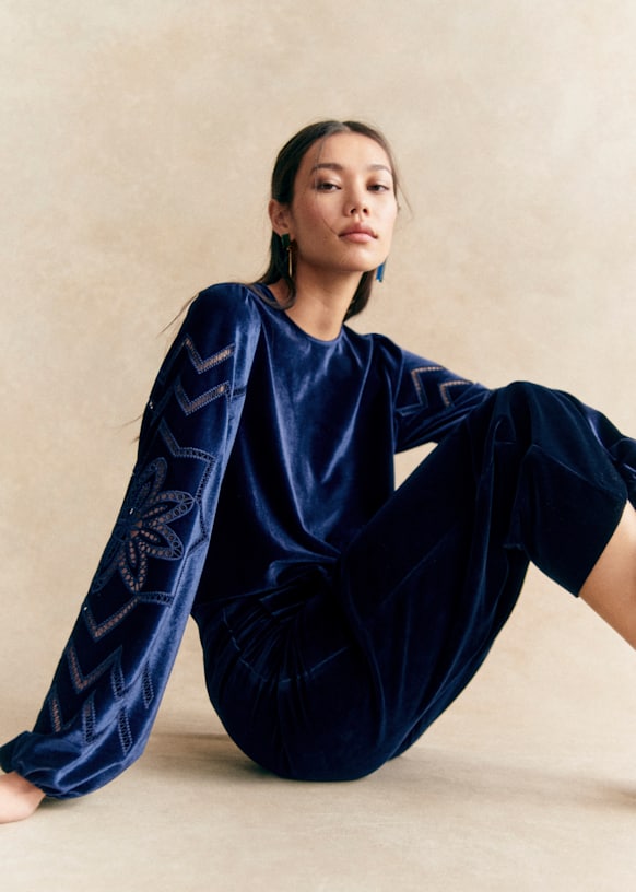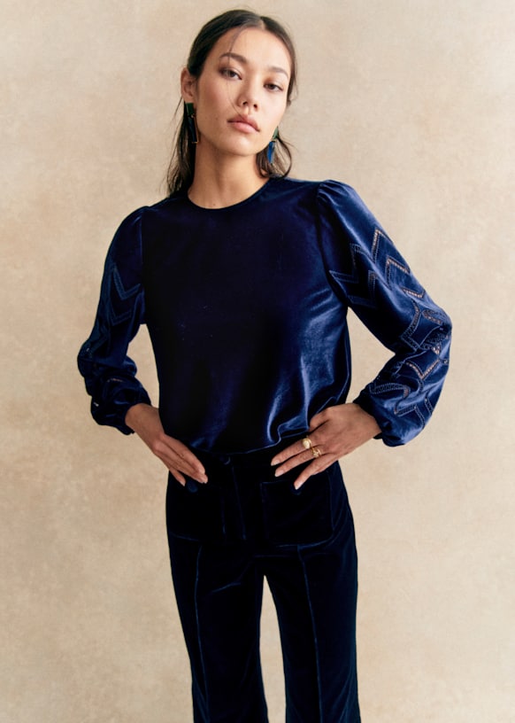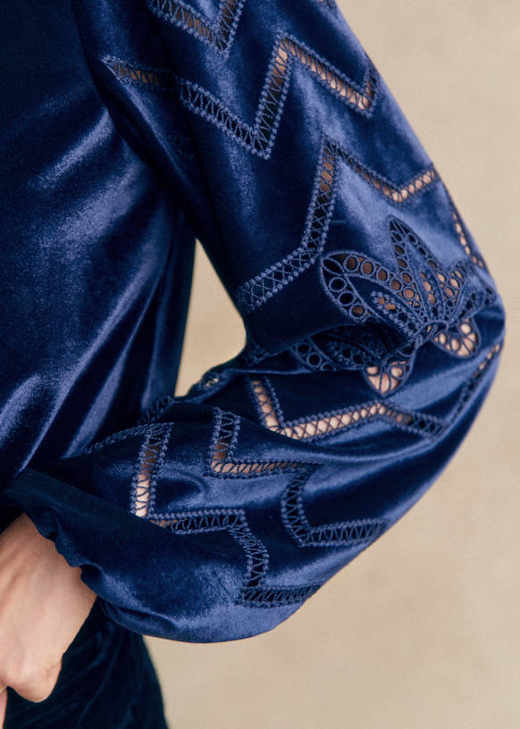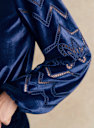 - Puffy sleeves with cut-outs and embroidery, tightened with elastic