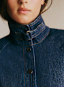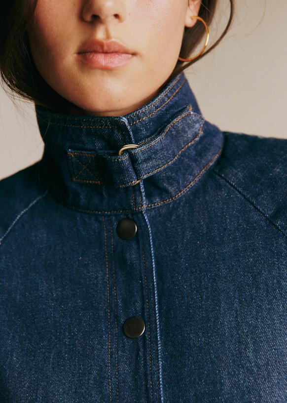 - Stand-up collar fastened with a buckle and a snap button