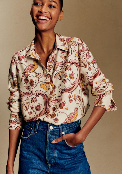 Sézane’s collaboration with Antoinette Poisson, the celebrated French maison renowned for its artisanal wallpapers and decorative papers, brings its historic savoir-faire to its first prêt-à-porter collection.
