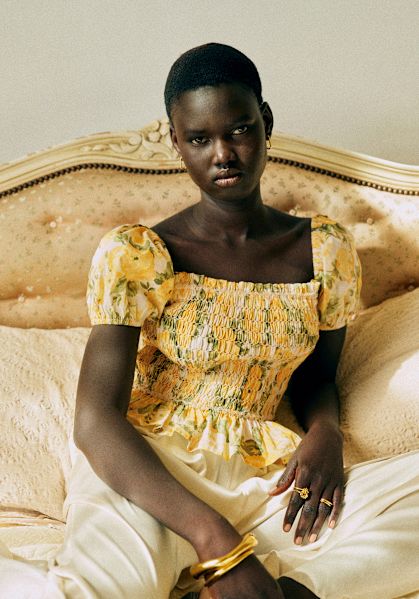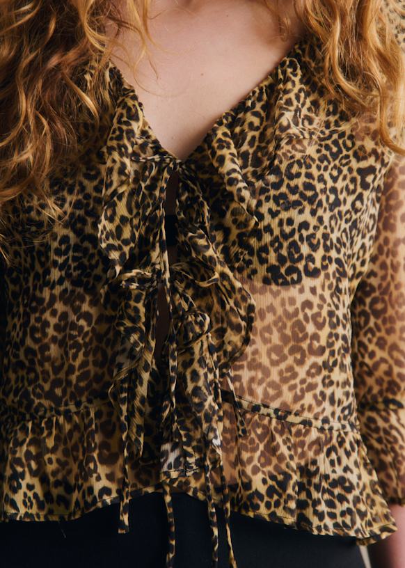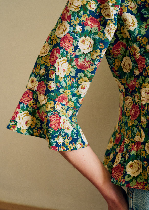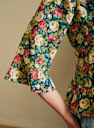 - Volantes caracol incrustados en el escote, en el bajo de las mangas y en el cuerpo